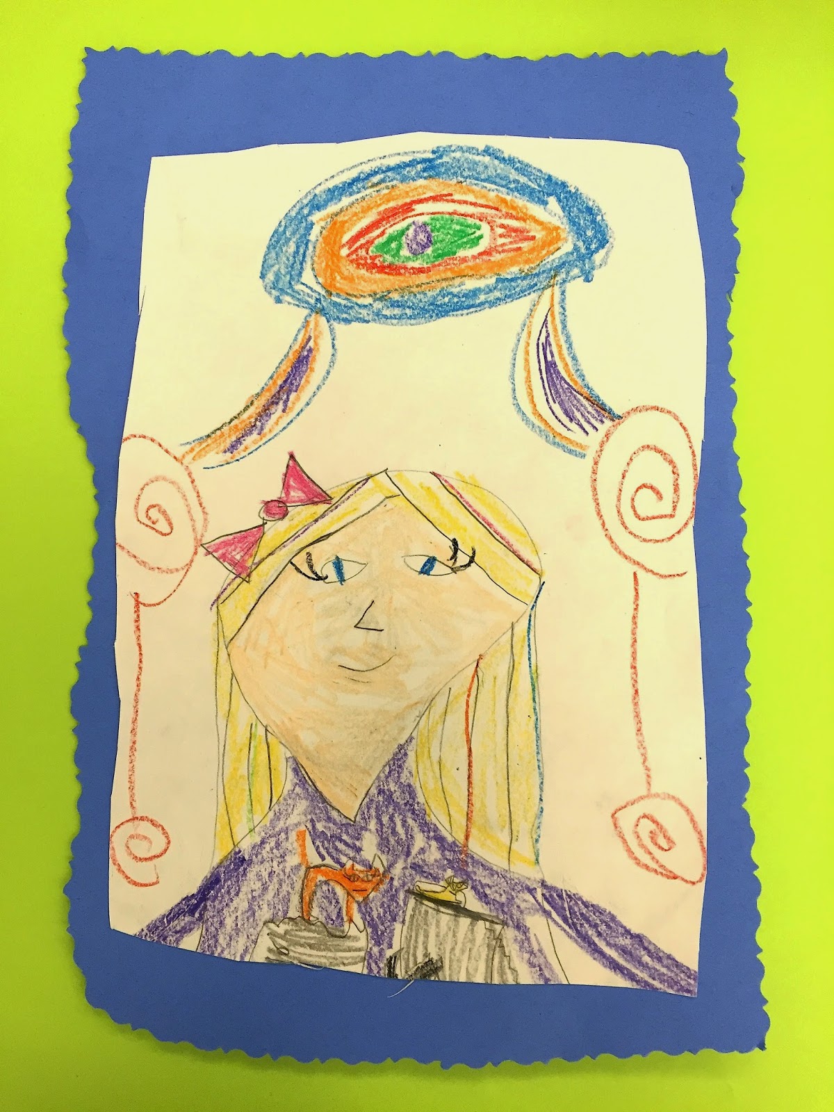 *First we discussed the term self-portrait and talked about what a self-portrait includes. Next, we discussed the placement of things on our faces like our eyes, nose, mouth, ears, etc. Each kiddo drew their self-portrait with pencil and colored them using colored pencils. To complete our portraits, we attached a frame using crazy scissors to cut out a border.